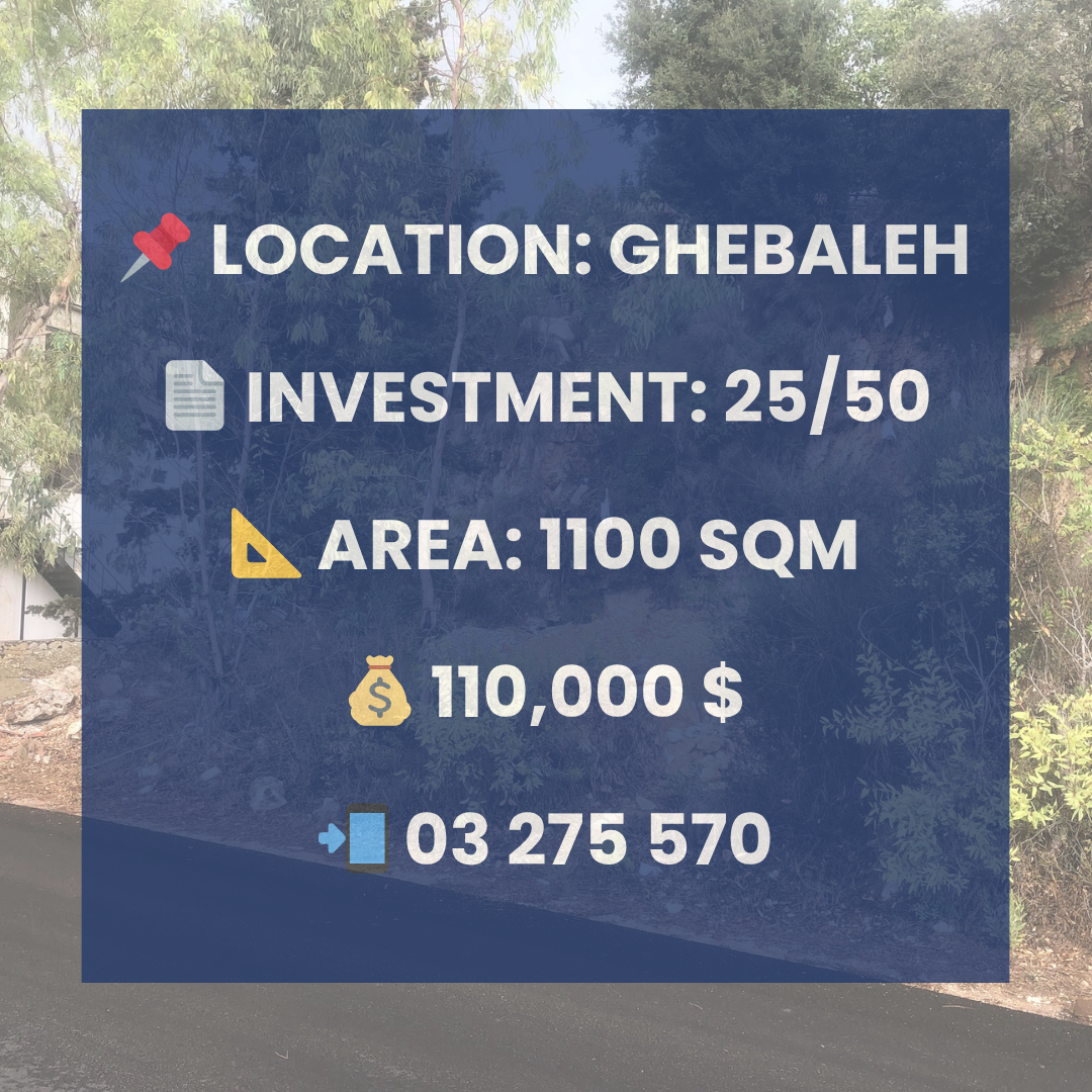 Land in Ghebaleh, 1100 m2, investment 25/50, on the main road Selling price: 110,000$